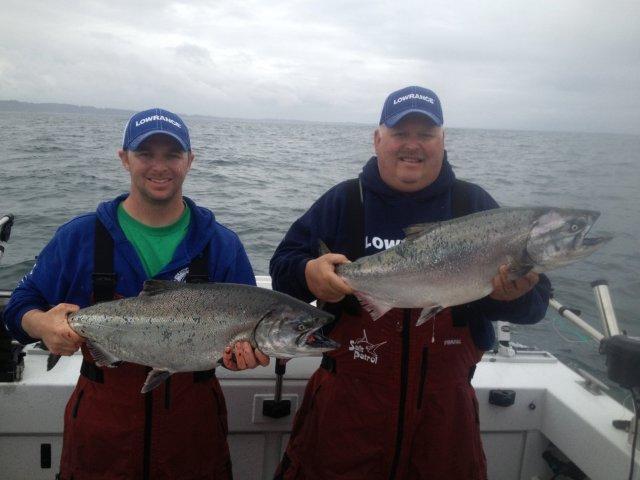 We found fish north of the Grays Harbor about 20 miles out in a 180 ft of water. Using the Lowrance Structure Scan it was pretty easy to stay on the bait schools that were suspended in 90 ft of water where the fish were feeding. We caught kings fishing 90-120ft on the 'riggers and there were lots of 3-6lb coho in the top 30 ft.
