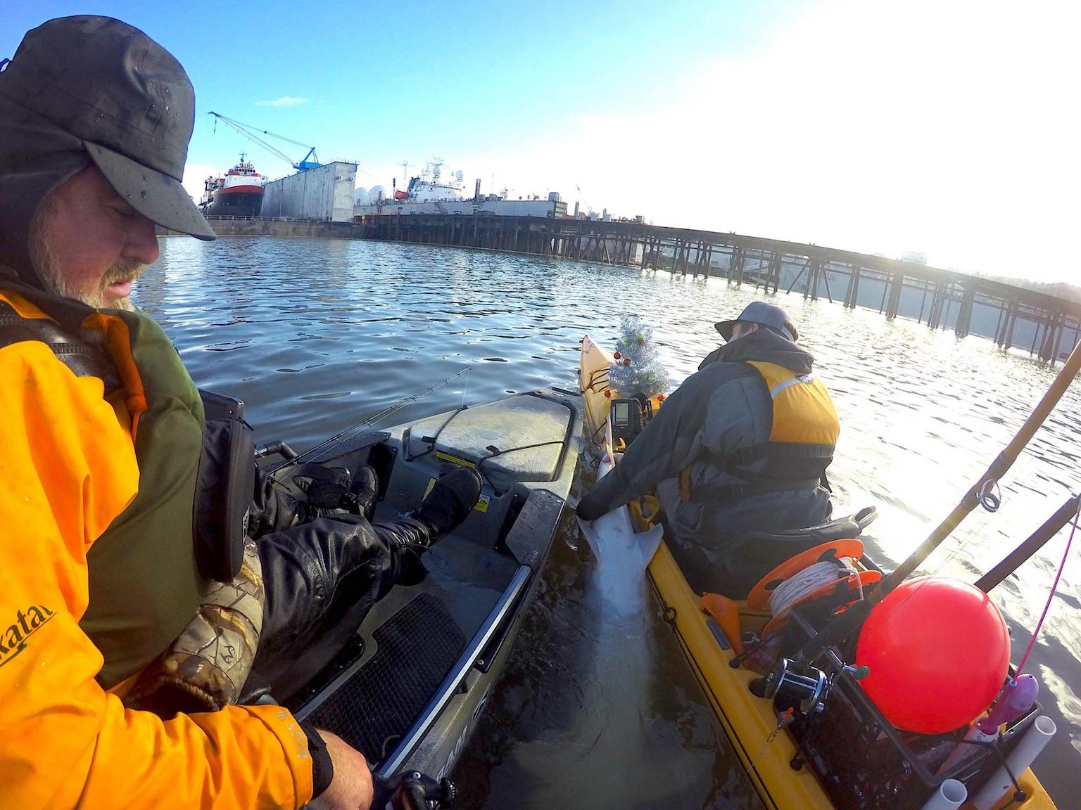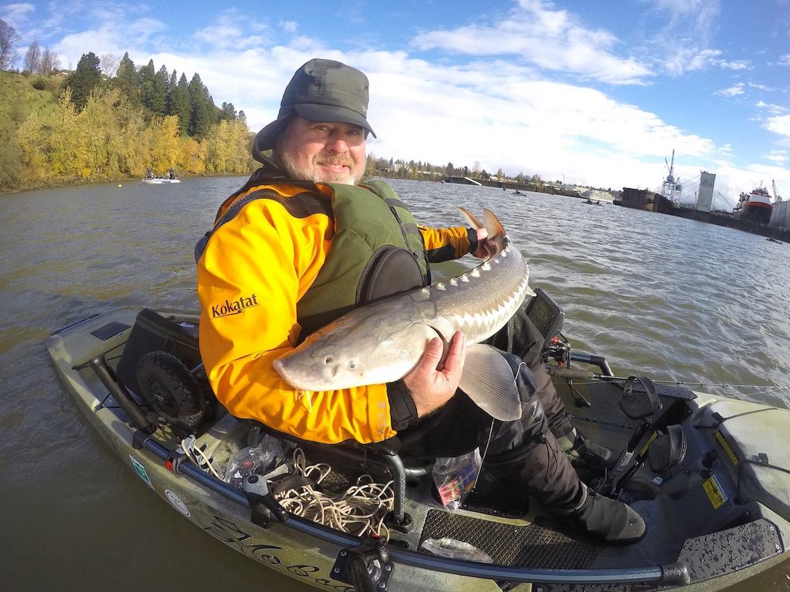 A group of kayak fishermen get together every year for their annual Sturgeon Slay Ride Meet Up on the Willamette River. The fishery is catch and release only using single barbless hooks. The bait can be what ever left over herring, squid or fish you have sitting in your freezer. With a 3 to 6 oz lead weight, lower your bait and allow it to sit on the bottom . Wait for their rather subtle bite, set the hook and then hang on for a ride! There's a reason this area is nicknamed "Jurassic Park". Sturgeon are true dinosaurs and deserve to be admired and protected. Nearly everyone in our group caught at least one fish. We left with smiles, sore arms and memories we won't forget.
