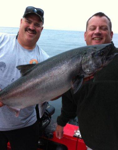 We managed to sneak out this morning and had a Silver Horde plug get ripped of the clip by this dandy chinook landed by Mike Burns on the right.