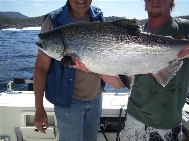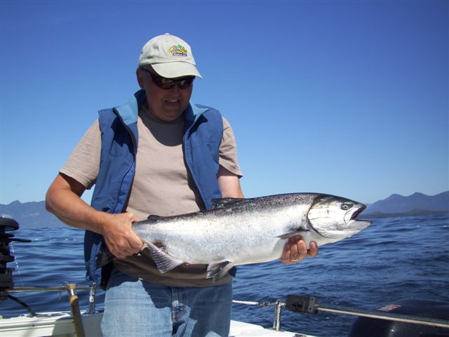 Tom Nelson wasn’t the only one catching fish last week out of Nootka Sound Resort. I took my wife, Nancy, on The Outdoor Line August 25 – 28 trip. What a place!! They put us up in what’s called The Executive Quarters building. Our room was larger than most motel rooms, with windows on three sides, two comfortable queen beds, and our own bath. I know lots of places advertise gourmet food, but at NSR it’s for real. Amazing presentation (the cooks are artists), intricate flavors, and you’re not just eating the days’ catch. For example, we had fancy baked chicken quarters and smoked on-site pork loin on consecutive nights. Each dinner is preceded by “Appy” hour served around the fire pit. One night was cioppino and garlic bread; another was grilled ribs; and another was crab with melted butter and spring rolls made with fresh veggies from the garden float. The staff was attentive, numerous, and very friendly. Our boat was a 30’ ProLine with twin 300 horse Suzuki outboards, fast and roomy.